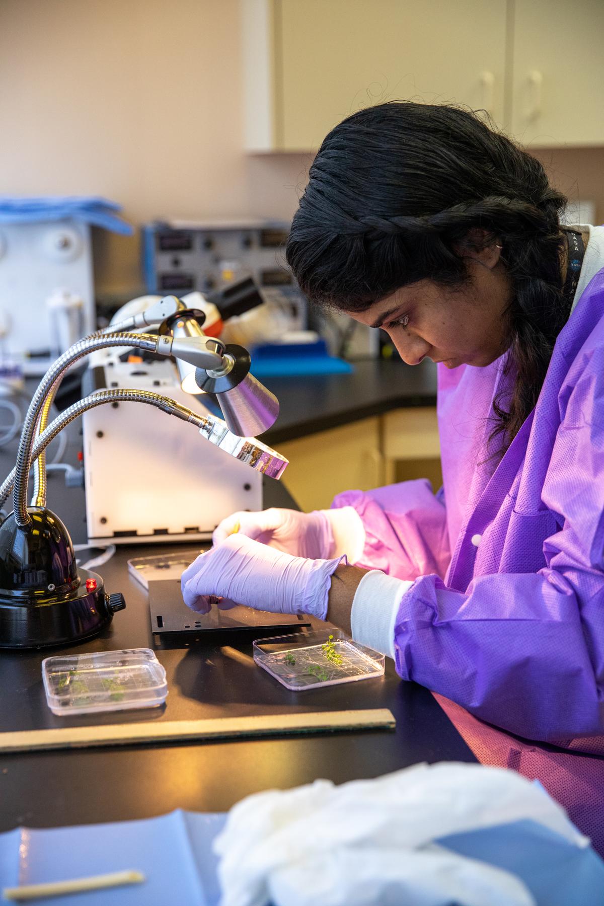 Srujana Neelam, a researcher working at NASA’s Kennedy Space Center in Florida, dissects Arabidopsis thaliana plants from petri plates used in microgravity simulation devices in the Microgravity Simulation Support Facility (MSSF) inside the Neil Armstrong Operations and Checkout building on Feb. 11, 2020. The facility was developed to provide ground simulation capability to the U.S. research community in order to supplement the limited opportunities to access the International Space Station and other platforms for microgravity research. The MSSF is designed to support biological research on microorganisms, cells, tissues, small plants and small animals. The simulator provides NASA with an alternative platform for microgravity research and creates the opportunity to conduct experiments on the space station in parallel with conditions of simulated microgravity on the ground.