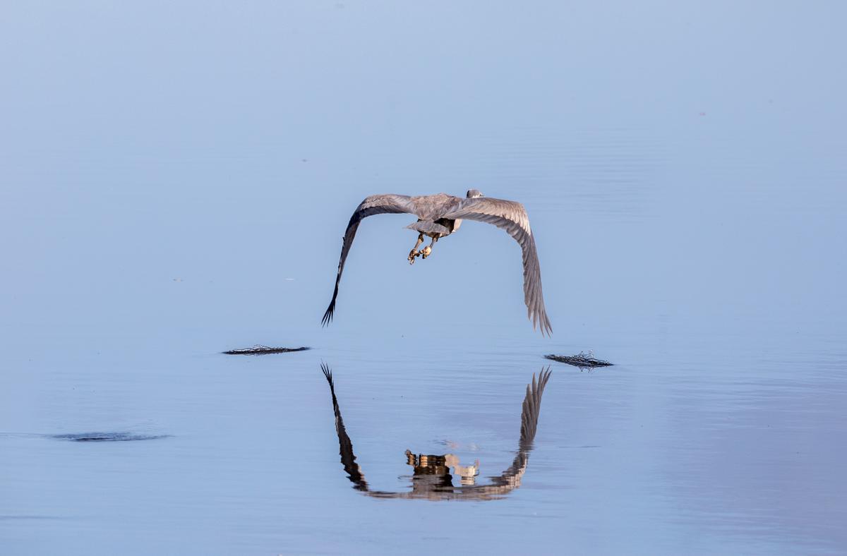 Creating an artistic reflection, a Great Blue Heron skims its wings on a waterway at NASA's Kennedy Space Center in Florida on Jan. 11, 2021. The center shares a border with the Merritt Island National Wildlife Refuge. More than 330 native and migratory bird species, along with 25 mammal, 117 fish, and 65 amphibian and reptile species call Kennedy and the wildlife refuge home.