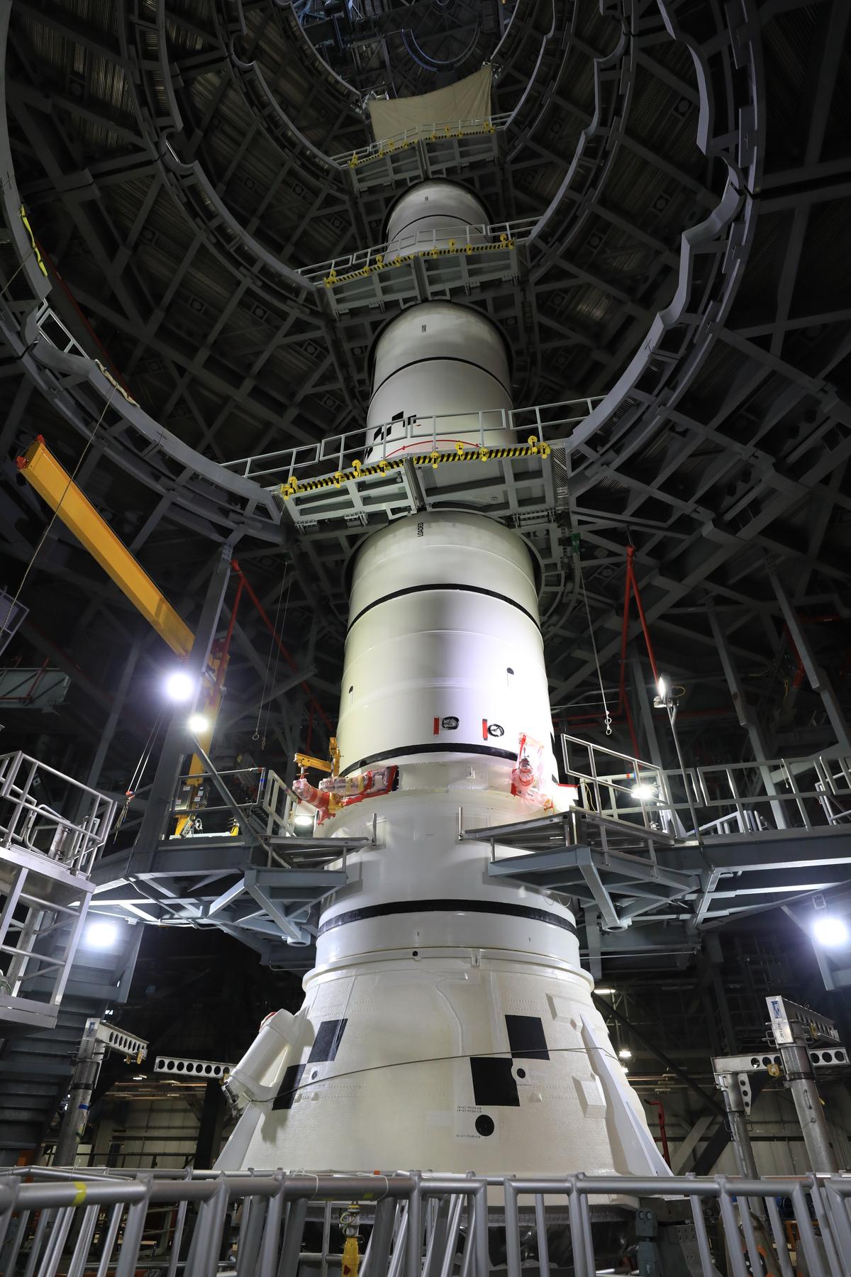 A close-up view in High Bay 3 of the Vehicle Assembly Building at NASA’s Kennedy Space Center in Florida, as the left-hand center center booster segment for Artemis I is lowered onto the center aft booster segment on the mobile launcher for the Space Launch System (SLS) on Jan. 21, 2021. Workers with Exploration Ground Systems and contractor Jacobs teams will stack the twin five-segment boosters on the mobile launcher in High Bay 3 over a number of weeks. When the core stage arrives, it will join the boosters on the mobile launcher, followed by the interim cryogenic propulsion stage and Orion spacecraft. Manufactured by Northrop Grumman in Utah, the twin boosters provide more than 75 percent of the total SLS thrust at launch. The SLS is managed by Marshall Space Flight Center in Huntsville, Alabama. Under the Artemis program, NASA will land the first woman and the next man on the Moon by 2024. The first in a series of increasingly complex missions, Artemis I will test the Orion spacecraft and SLS as an integrated system ahead of crewed flights to the Moon.