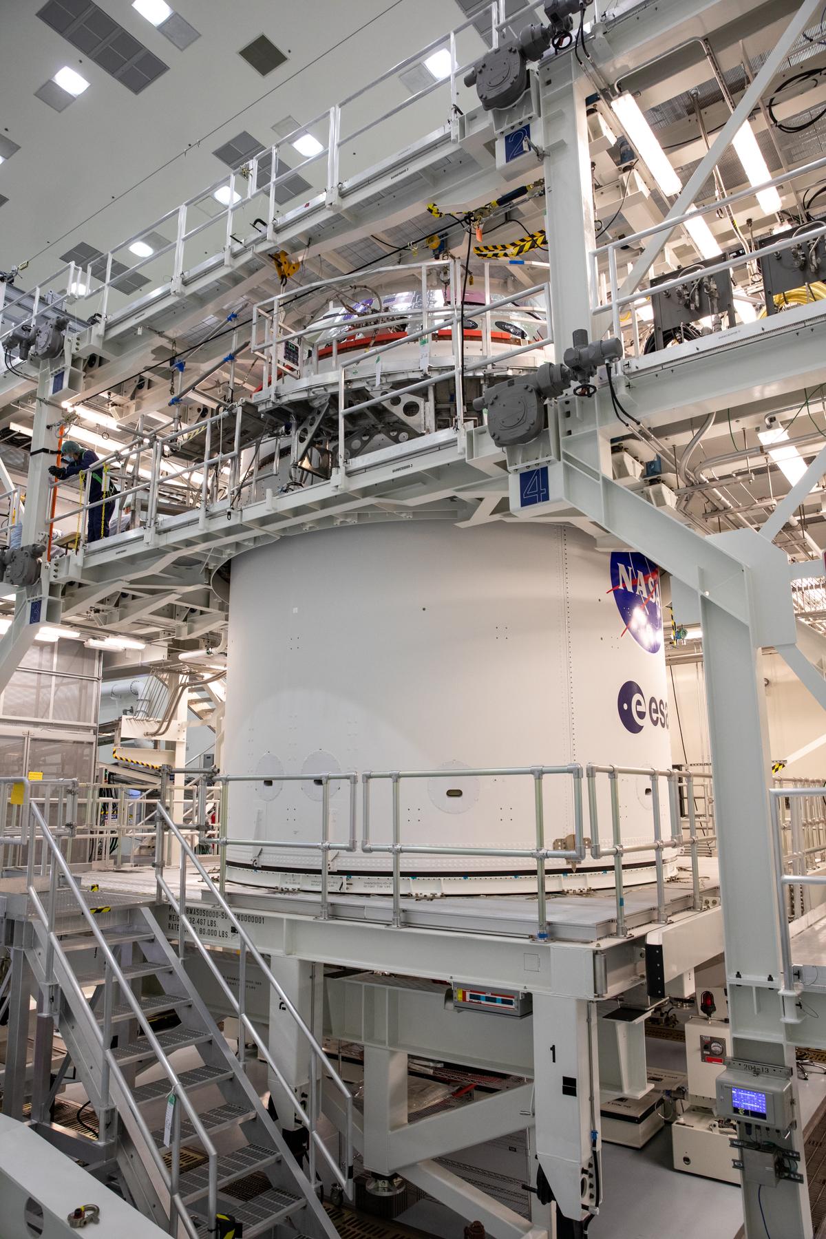 Artemis I extends NASA and ESA’s (European Space Agency) strong international partnership beyond low-Earth orbit to lunar exploration with Orion on Artemis issions, as the the ESA logo joins the historic NASA “meatball” insignia on the Artemis I spacecraft adapter jettison fairing panels that protect the service module during launch. Orion is currently stationed at NASA’s Kennedy Space Center in the Multi-Payload Processing Facility, where it will undergo fueling and servicing by NASA’s Exploration Ground Systems and Jacobs Technology teams in preparation for the upcoming flight test with the Space Launch System rocket under the agency’s Artemis program.